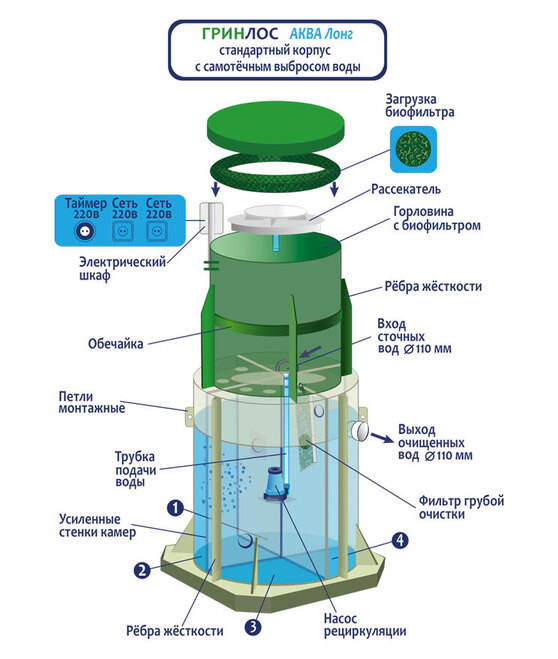 Все характеристикиПринцип работы ГРИНЛОС Аква ЛОНГГРИНЛОС Аква Лонг изготавливаются из полипропилена блок-сополимера чешского производства.Корпус септика разделен на четыре отсека со специальными технологическими переливами.Перетекая из одного отсека в другой, стоки проходят процесс отстаивания, усреднения, отделения нерастворимых фракций (жиров и т.д.), которые остаются в первом отсеке и осветления.Очистка стоков происходит с помощью Аквабных бактерий, расположенных на биофильтре. Многократное взаимодействие загрязненной жидкости с бактериями осуществляется благодаря работе насоса-рециркулятора.Также этот насос позволяет стокам насыщаться кислородом, что необходимо для поддержания жизнедеятельности бактерий. Все электрические элементы в септике ГРИНЛОС Аква Лонг работают по таймеру, что позволяет значительно сэкономить на электричестве и увеличить временной интервал между обслуживанием септика.После многократных циклов очистки условно чистая техническая вода, через специальный перелив – успокоитель попадает в последний отсек, откуда, в зависимости от модели (самотечная или принудительная) выводится наружу (на грунт, в дренажную или ливневую канаву и т.д.)..Преимущества