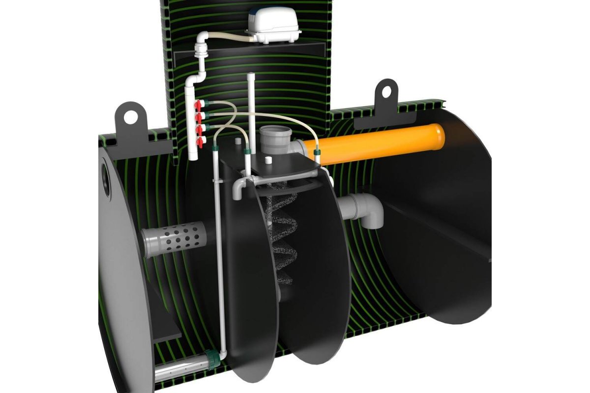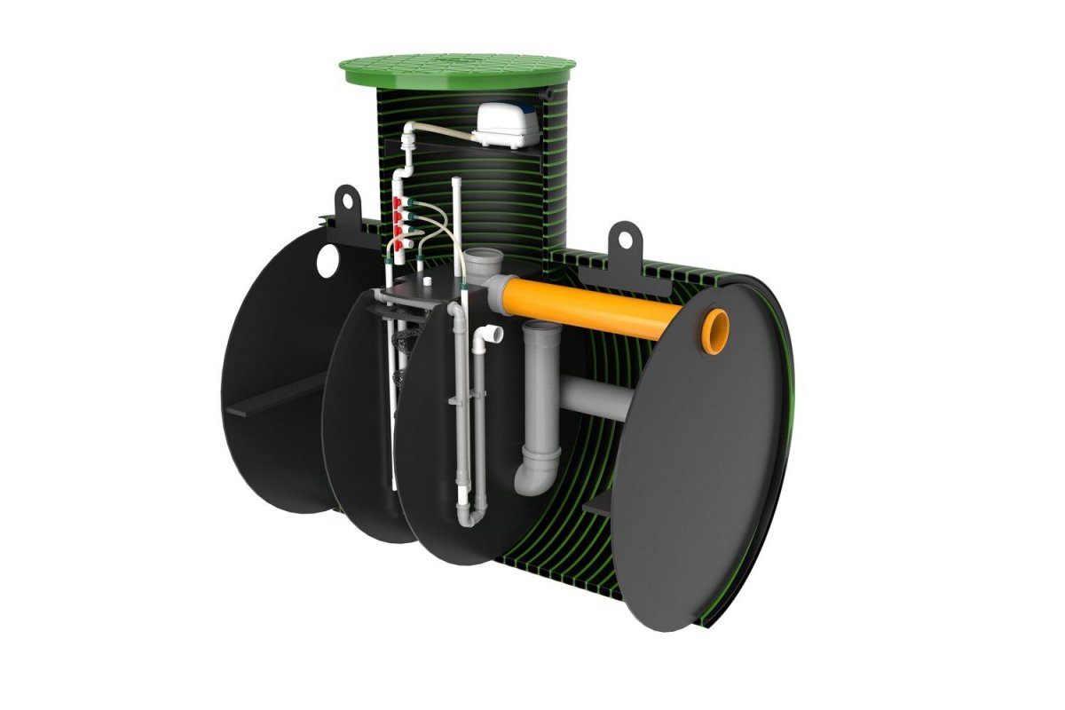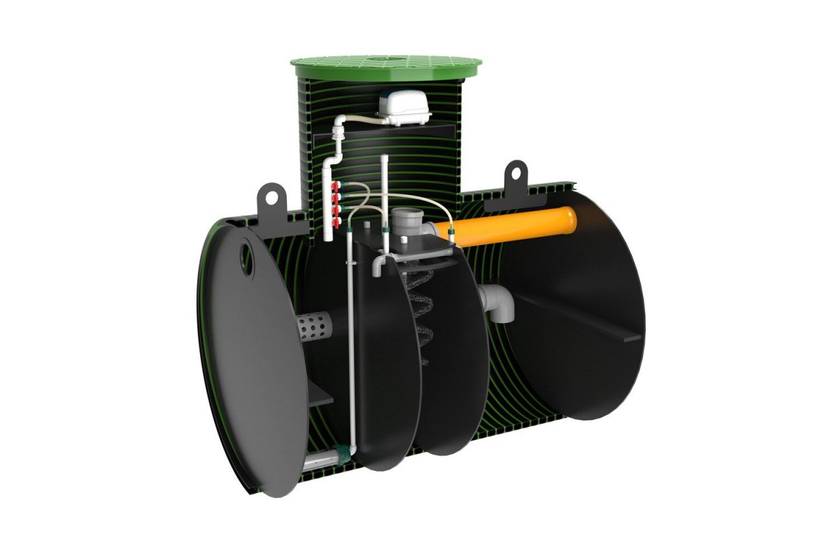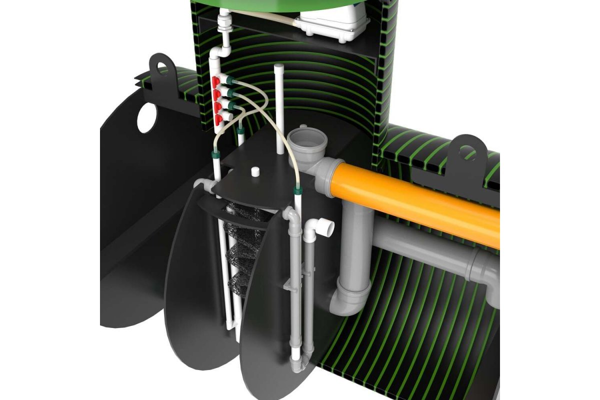 Принцип работы данного септика основан на мелкопузырчатой аэрации, которую создает аэратор (компрессор, воздуходувка), поставляемый в комплекте станции. За счет подачи воздуха в станцию, а также за счет дополнительных механизмов очистки происходит полная очистка хоз. бытовых стоков до уровня технической воды биологическим способом. Степень очистки станции при идеальных условиях достигает 98%. Вода на выходе не имеет запахов, абсолютно прозрачна и бесцветна. Такую, экологически чистую техническую воду можно достаточно долгое время дренировать в грунт, в канаву, дренажный колодец, в поле фильтрации. Вопреки всем мифам, в станцию не нужно добавлять никаких бактерий!Принцип работы: