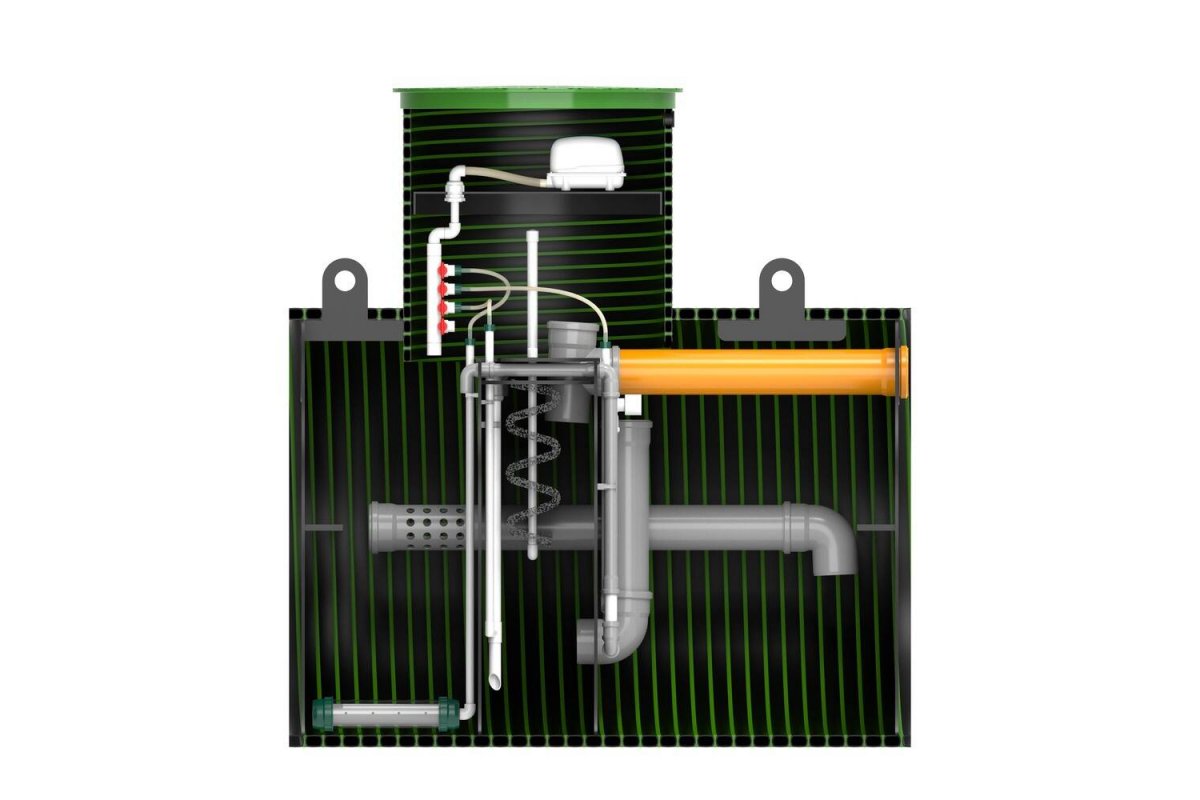 - Все канализационные стоки из дома попадают в приемную камеру А (подключение д. 110 мм). Здесь происходит процесс денитрификации, осаждения крупных органических фракций и всплытие избыточных жиров на поверхность.